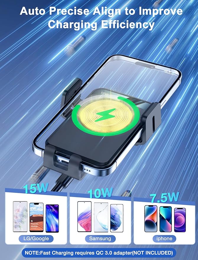 - 【Wireless Car Charger】15W Wireless Fast Charging for LG V50/V40/V30/G8/G7; 10W for Samsung Galaxy S23 Ultra/S23+/S23/S22 Ultra/S22/S21/S20/Note 20/Note 10+/Note 10; 7.5W for iPhone 16 15/14/14 plus/14 pro/14 pro max/13/13 Pro/12 Pro Max/12 Pro/12/11 /11 Pro /11 Pro Max /SE /XS /X/XR/8 Plus/8; Note: 15W/10W/7.5W Fast Charging requires QC 3.0 car charger (NOT INCLUDED), 5W standard wireless charging for other wireless charging Phones (5V/2A adapter is required).