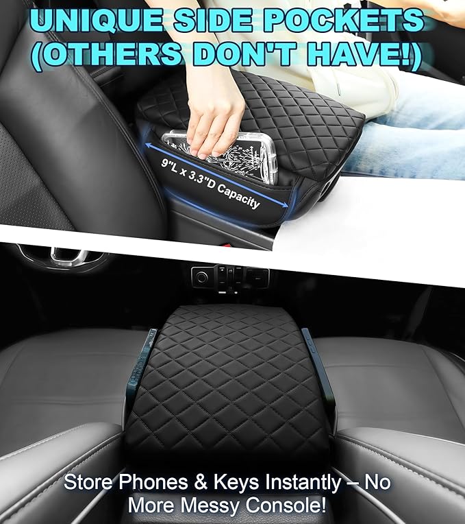 - [Dual-side Storage Bags] - This Wrangler arm rest pad has storage function. The Wrangler console cover convenient for driver and passenger to put some small items such like cards in. Pocket width: 9.4in, depth: 3.34in.