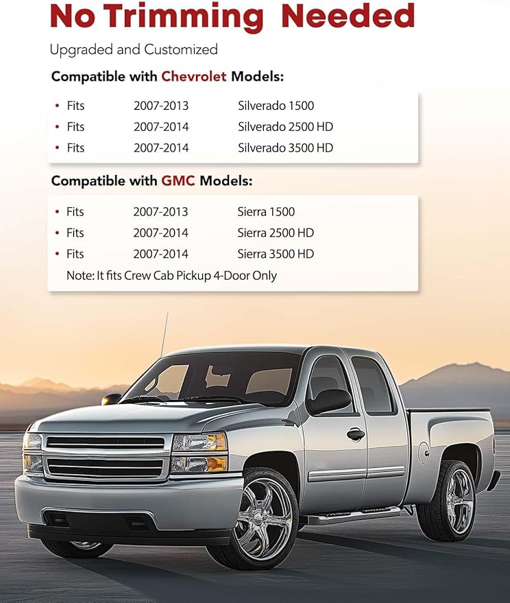 - Customized for Your Vehicle: This floor mat is Compatible with Chevrolet Silverado 1500 2007-2013, Silverado 2500 HD/3500 HD 2007-2014; Compatible with GMC Sierra 1500 2007-2013, Sierra 2500 HD/3500 HD 2007-2014(It fits Crew Cab Pickup 4-Door Only)