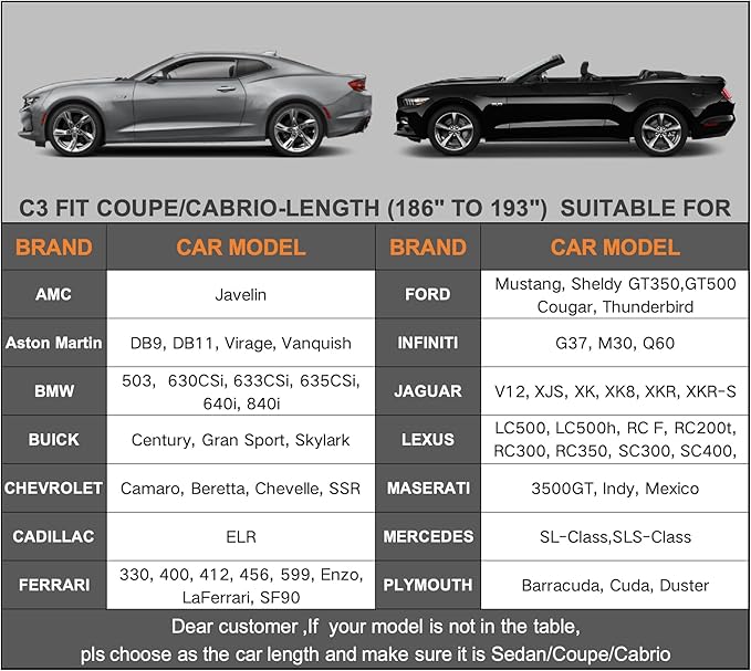- 【Dimension C3】Universal fit for Coupe/Sedan/Cabriolet which length is 186-193 inch (Not for hatchback and SUV ). Suitable for Ford Mustang,Shelby, Chevy Camaro, Jaguar XK, XKR,Etc.