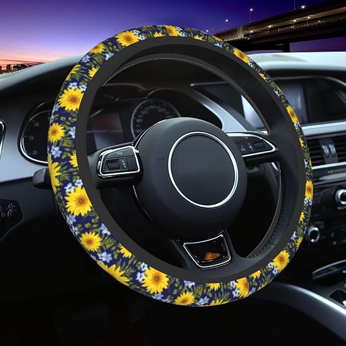 Sunflower Steering Wheel Cover with 2 Car Coasters Non Slip Neoprene for Women Men Universal 15 Inch