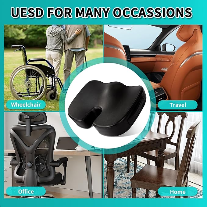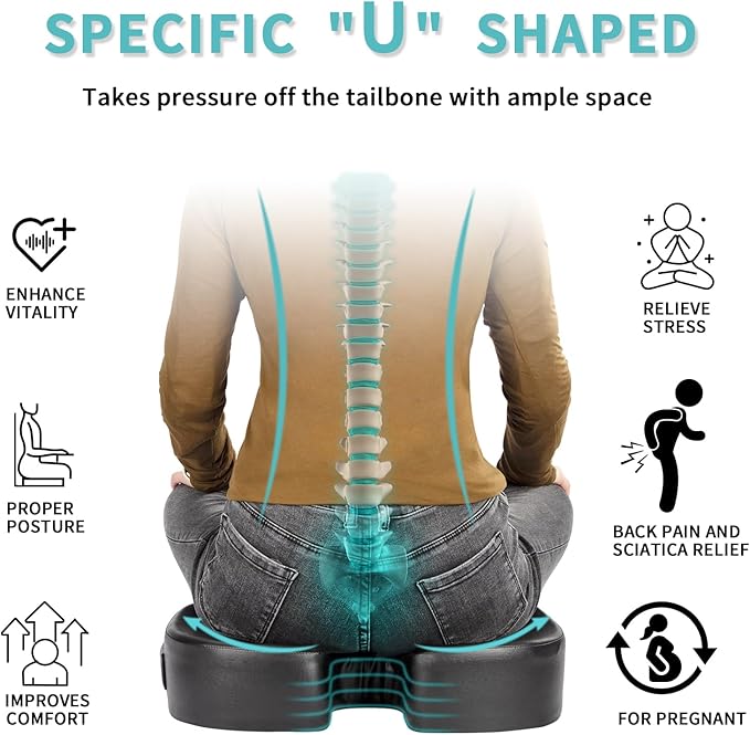 - β [Ergonomic Design & Comfortable Foam]: Our U-shaped design coccyx cushion is engineered to perfectly contour to the curves of hips, improving blood circulation. It effectively alleviates problems like lower back pain and sciatica caused by prolonged sitting. The 4-inch thickness of the memory foam provides ample support, reducing pressure on buttocks, lower back. It offers a soft and comfortable feeling, ensuring that the cushion retains its shape even after long periods of sitting.