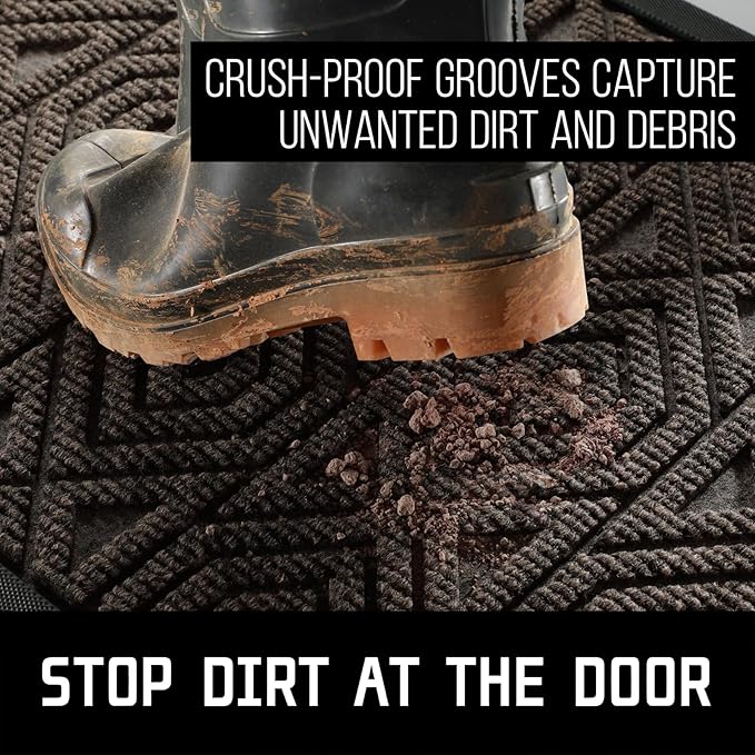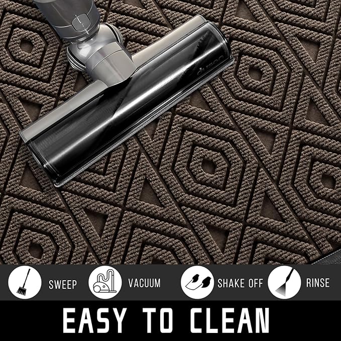 - [CAPTURE DIRT AND MOISTURE] Yimobra front door entryway mat outdoor with unique pattern design, forming a detention dam extending in all directions, helping to capture dirt, dust, gravel, mud, sand, grass or other messy debris and prevent them from entering Indoor; The surface of floor mat beautifully woven polyester fabric absorbs moisture, and the sturdy oblique rubber edge will not accumulate water in rainy and snowy days, keeping your home dry and clean