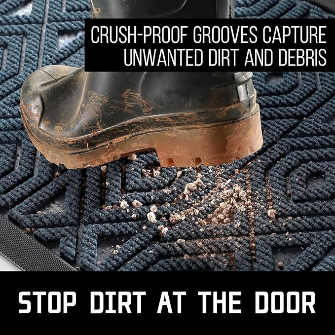 - [CAPTURE DIRT AND MOISTURE] Yimobra front door entryway mat outdoor with unique pattern design, forming a detention dam extending in all directions, helping to capture dirt, dust, gravel, mud, sand, grass or other messy debris and prevent them from entering Indoor; The surface of floor mat beautifully woven polyester fabric absorbs moisture, and the sturdy oblique rubber edge will not accumulate water in rainy and snowy days, keeping your home dry and clean