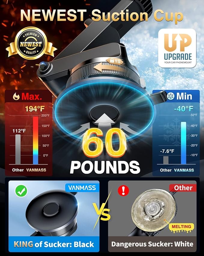 - 【High-end = Quality Materials + Grandmaster Design】VANMASS car phone mount made of PC+ABS material has passed 4 environmental reliability tests and has a temperature resistance range of -40℉ to 194℉, it is also highly resistant to UV rays (Ensuring reliability even in the sun), and the telescopic pole uses a reinforced sliding rail structure to greatly reduce wobbling during driving. This suction phone cradle obtained CP65 / REACH / RoHS safety certifications