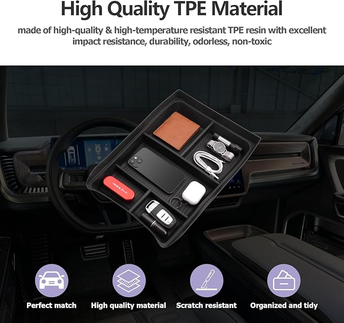 - [Extra Space] organizer for Rivian R1T/R1S 2025 console,2026 Rivian R1T/R1S accessories, 2025 Rivian R1T/R1S glove box organizer increase the available space of the center console, you can easily store and access your items, such as pens, coins, keys, wallets, etc., and quickly access items without digging holes. Orderly storage helps your 2026 Rivian R1T/R1S center console get rid of the messy storage environment