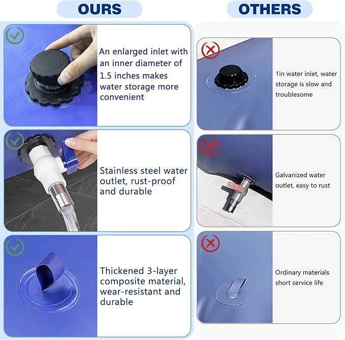 - Leak-Proof with Quality Seams – Designed with strong, reinforced seams and a leak-proof build to ensure secure, reliable water storage, ideal for emergency situations, RV boondocking, or farm irrigation.
