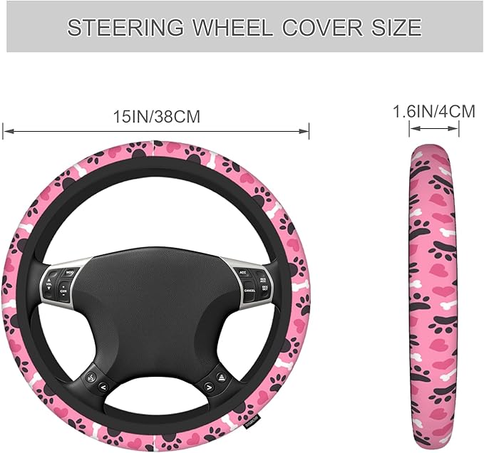 Dog Paw Car Steering Wheel Cover - 15 Inch Pink Heart Bone Dog Pet Footprint Universal Steering Wheel Accessory