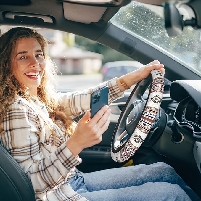 Tribal Navajo Style Car Steering Wheel Cover - 15 Inch Southwestern Native American Style Geometric Pattern Elastic Universal Steering Wheel Cover for Trucks & Auto