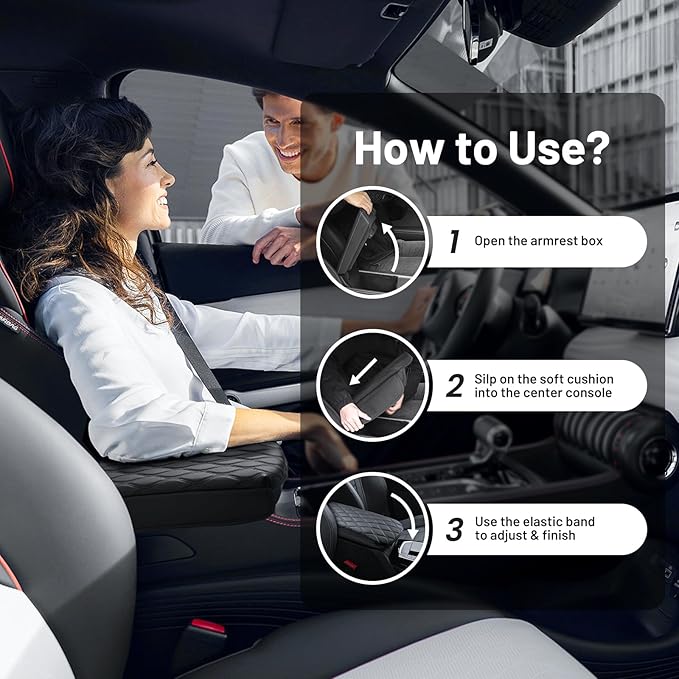- Simple Installation---This car arm rest padded cushion features elastic bands for a snug fit, preventing it from wobbling. The back is covered with raised dots to keep the center console cover in place. Simply open the armrest box, slide the elastic band into the cover, and close it up.