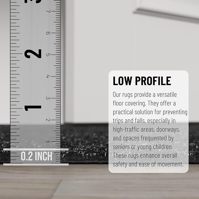 - [ULTRA THIN PILE]: An ultra thin pile thickness of 0.2 inches offers ideal functionality that is perfect for busy areas, underneath furniture, and in entryways as it will not obstruct doorways.