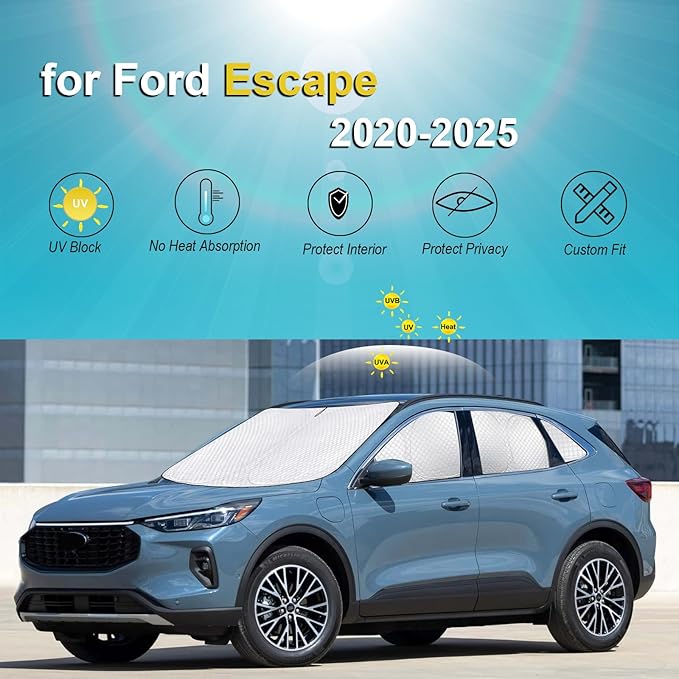 - 【100% Perfect Fit】:The car window shade is specially designed for Ford Escape 2020 2021 2022 2023 2024 2025.No Gap,100% Perfect fit.The window shades for the car are designed to cover the whole exterior window,Best for baby in the car and overnight car camping essentials. Protect your car from early morning light disturbances and maintain privacy when car camping(Tips: Please confirm the model of your car before ordering) .
