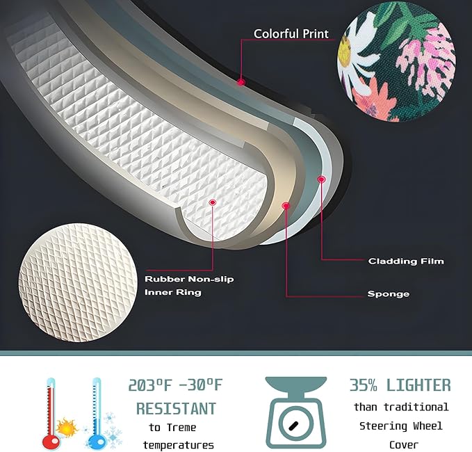 - DURABLE MATERIAL: The Flower, Floral, Daisies steering wheel cover is made of durable polyester fabric with fine workmanship, reinforced stitches and wear-resistant material.The inner is made of natural rubber, which is sun-proof, wear-resistant and corrosion-resistant,Non-slip rubber material can hold your steering wheel securely without falling off.