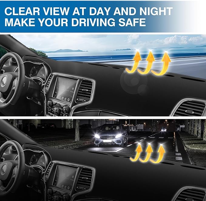 - [Premium Material] Our dash mat for Jeep Grand Cherokee made of rich quality polyester. Soft, breathable and odorless. Not easy to wrinkle. All edges of the car sunshade mat are carefully hemmed and stitched, making the cover comfortable to touch. Its surface is not completely smooth, so items will not fall off.