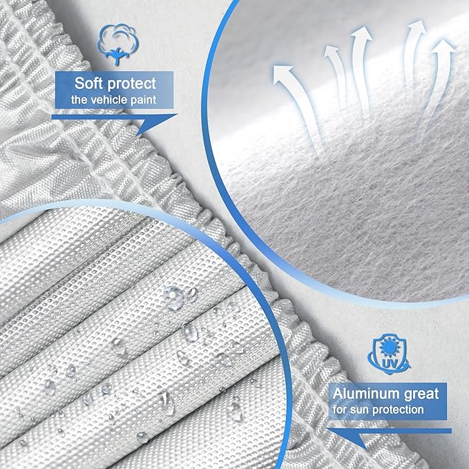- 【Heavy-Duty Materials】Cotryvox car covers are constructed from heavy-duty materials. The outer layer of PE provides 100% waterproofing, while an aluminum membrane in between extends the cover's lifespan. This makes it an excellent choice for long-term use.