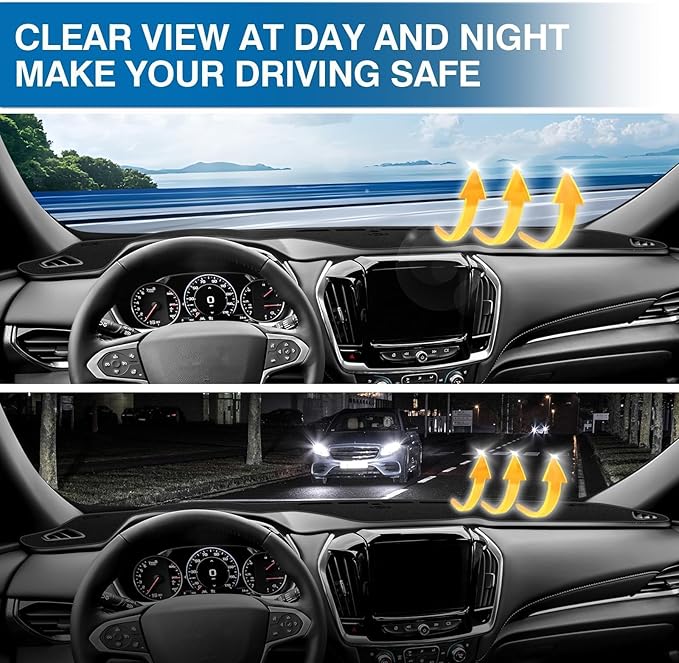 - [Premium Material] Our center console dash cover for Chevy Traverse made of rich quality polyester. Soft, breathable and odorless. Not easy to wrinkle. All edges of the car sunshade mat are carefully hemmed and stitched, making the cover comfortable to touch. Its surface is not completely smooth, so items will not fall off.