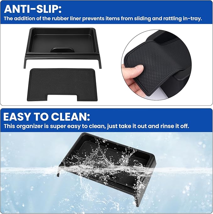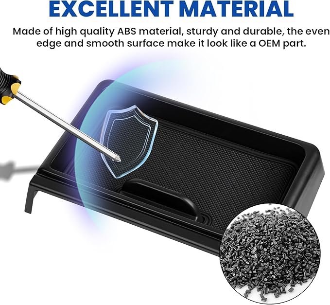 - Well-made Organizer: It is made of a durable and sturdy ABS shell. The even edge and smooth surface give the storage box an OEM part appearance. Additionally, the provided tasteless and non-toxic rubber liner effectively prevents items from sliding and rattling.