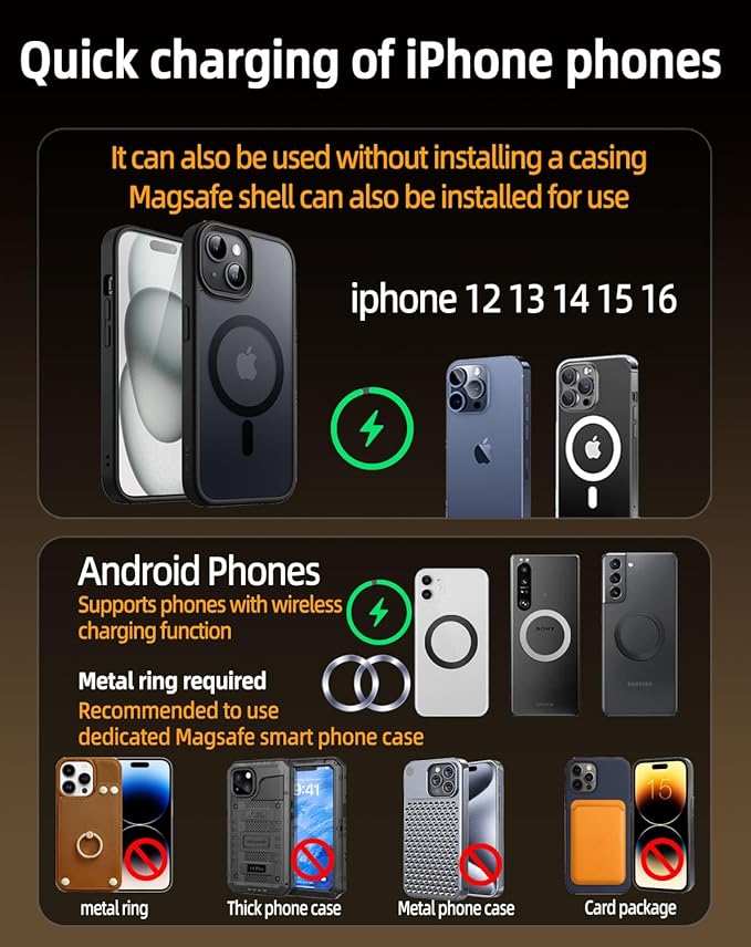 - Compatible with All Phones:The car phone holder is compatible with iPhone 16, 16 Pro, 16 Pro Max,15, 15 Pro, 15 Plus, 15 Pro Max, 14, 14 Pro, 14 Pro Max, 14 Plus, iPhone 13, 13 Pro, 13 Pro Max, 13 Mini, iPhone 12, 12 Pro, 12 Pro Max, or any MagSafe-supported phone case. It also works with the included magnetic plates, which can be attached to the back of regular phone cases, making it suitable for all phones, including Apple, Samsung, HTC, Google, and more.