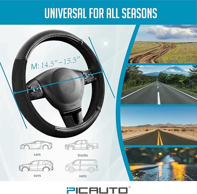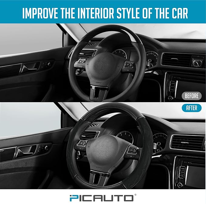 PIC AUTO Steering Wheel Cover, Silk Grain Leather Car Steering Wheel Protector, Comfortable Grip, Universal 14.5-15.5 Inch Anti-Slip Steering Wheels Accessories for Men & Women (Black)