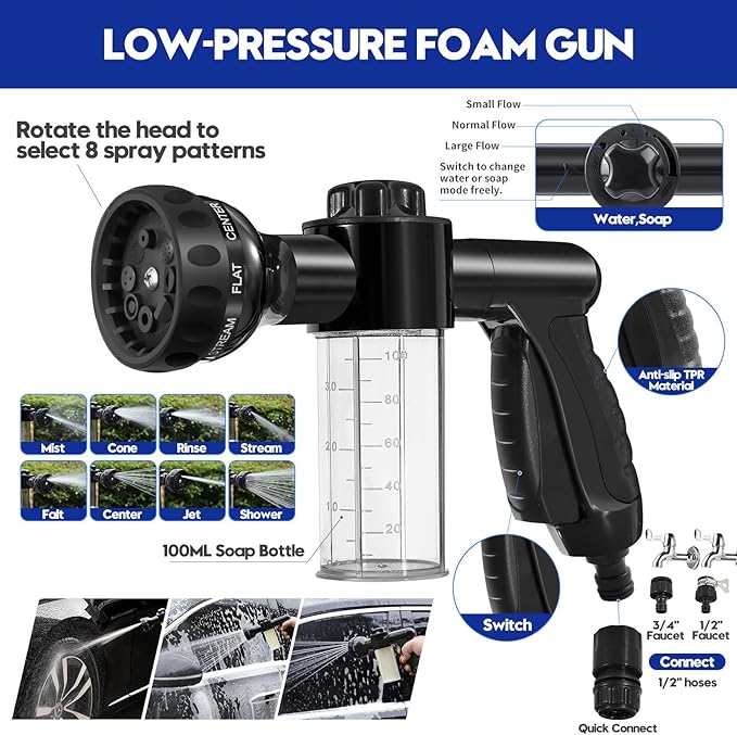 - Car Wash Foam Gun & Bucket & Windshield Cleaner Kit: The low-pressure foam gun with 8 spray patterns and 3 quick connectors to connect 1/2" hoses makes car wash effeicently. The portable 11L collapsible bucket is ideal for car washing at any time any place. Windshield cleaner tool helps to remove the fog, moisture or dirt on car window. Towels and wash mitt are soft and safe to wash on delicate surfaces. Please make sure that the towels have been washed before starting to use them
