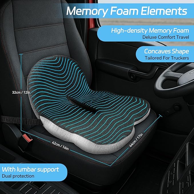 - Easy on the Road: Drivers drive with twice the confidence by using our top-of-the-line seat cushions made for powerful truckers! The cushion is made of medium-firm memory foam, so you can get rid of back pain and road fatigue. Designed to address stubborn back pain and annoying numbness, this truck seat cushion is a great choice for bosses in the trucking world. It's firm enough to give support and soft enough to ensure a comfortable ride, allowing you to drive your truck with both confidence and comfort.