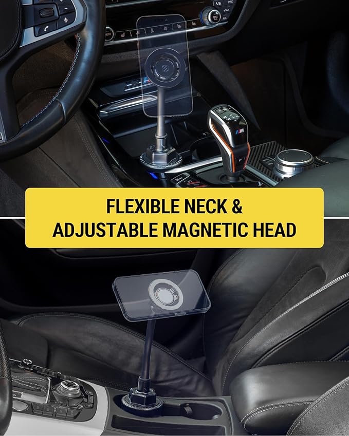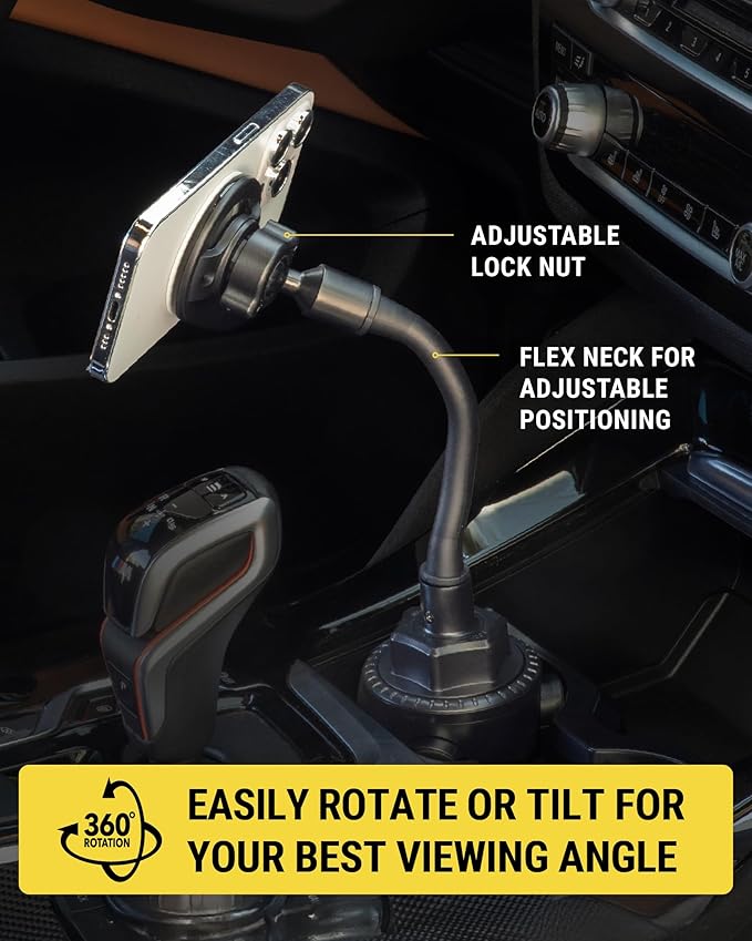 - Perfect Viewing Angle: The flexible neck and adjustable magnetic mount head of this phone holder keep your phone secure and accessible in any car, truck, SUV, or van cup holder, without obstructing your view. Easily adjust to the ideal angle for hands-free navigation, calls, and more