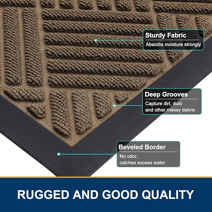 - Capture Dirt and Moisture: The surface of the Smiry door mat is crafted from woven polyester fabric. The deep grooves can effectively trap the dust, gravel, mud, sand and other clutter. The sturdy beveled rubber edge will not accumulate water. Even rainy, snowy or muddy weather will keep your home dry and clean