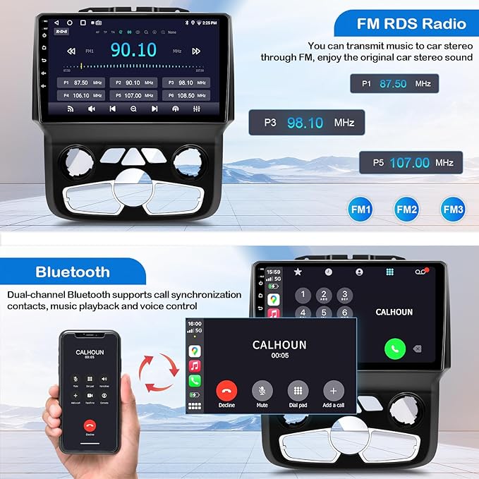 - [Wireless Apple Carplay & Android Auto]:Dodge Ram 1500 radio supports Apple Carplay and Android Auto.Simply connect your phone to your Android car radio via Wifi and Bluetooth, and you'll be able to access your phone's apps directly from your car stereo. You can focus on driving while wirelessly accessing features like map navigation, answering calls, playing music and more.