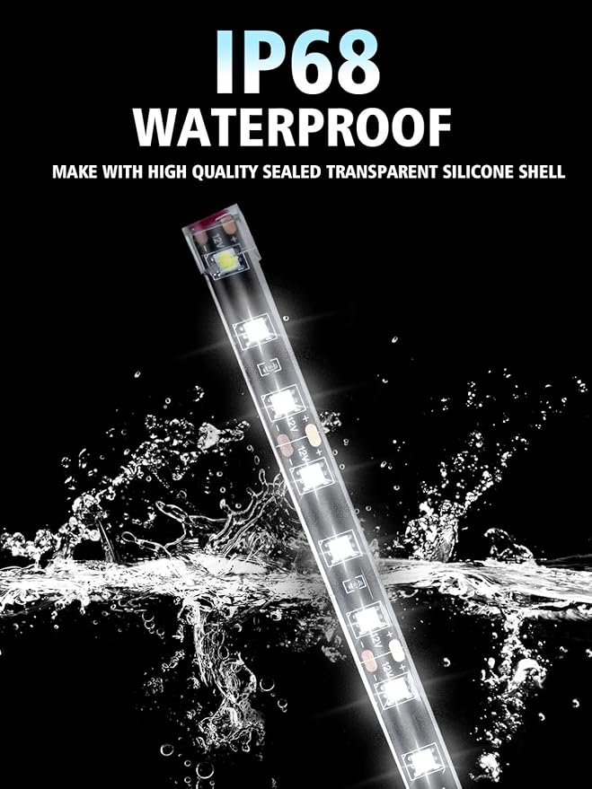 - 【Wide Application】12 inch waterproof LED light strip is perfect for car, truck, RV, SUV, camper, boat, golf cart under lights, motorcycle, cargo trailer, footwell, front grill, rear trunk, underbody lights, footlights, dashboard lighting, also used for home cabinet floor lights decorative steady light indoor and outdoor decorative light strip.