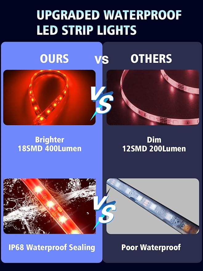 - 【Wide Application】12 inch waterproof LED light strip is perfect for car, truck, RV, SUV, camper, boat, golf cart under lights, motorcycle, cargo trailer, footwell, front grill, rear trunk, underbody lights, footlights, dashboard lighting, also used for home cabinet floor lights decorative steady light indoor and outdoor decorative light strip.