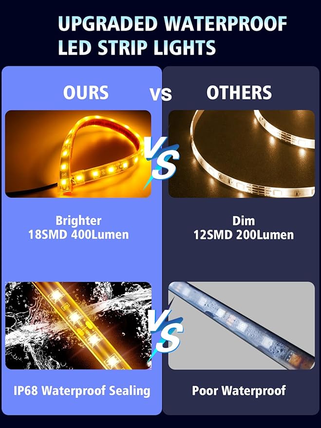 - 【Wide Application】12 inch waterproof LED light strip is perfect for car, truck, RV, SUV, camper, boat, golf cart under lights, motorcycle, cargo trailer, footwell, front grill, rear trunk, underbody lights, footlights, dashboard lighting, also used for home cabinet floor lights decorative steady light indoor and outdoor decorative light strip.