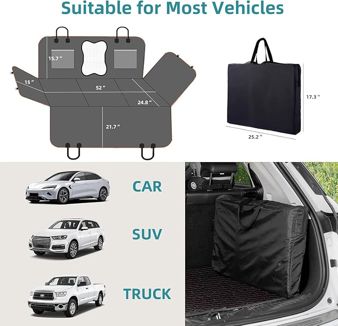 - Universal Fit & Quick Installation – Measuring 52”L x 24.8”W, this back seat extender for dogs fits most cars, SUVs, and trucks. Fit check before purchase is strongly recommended — please measure your rear seat to ensure proper fit, especially for wider or longer seats.