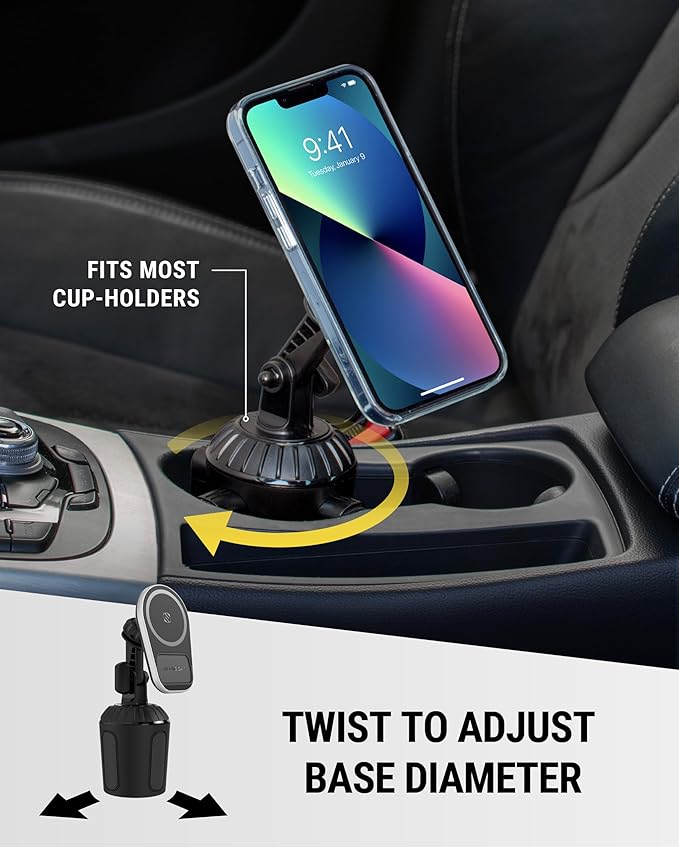 - MagSafe Car Charger Mount: Easily mount MagSafe iPhone models (12 and later) or Qi-enabled phones and enjoy up to 15W fast wireless charging. This cup holder phone mount efficiently powers your device while ensuring a secure fit while driving