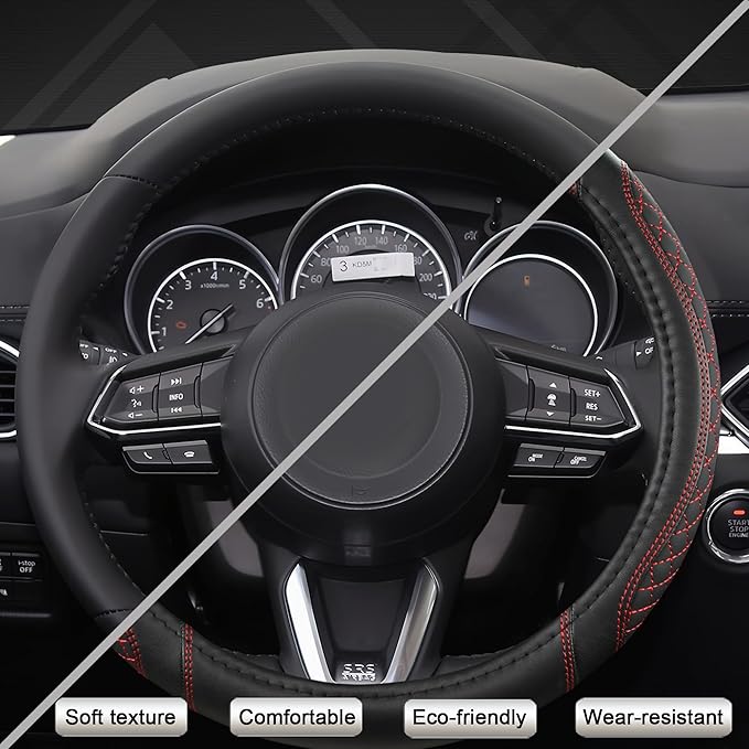 - 【HIGH-QUALITY MATERIAL】 This steering wheel cover is made of high-quality leather, which is soft texture, comfortable, eco-friendly, wear-resistant, and durable.