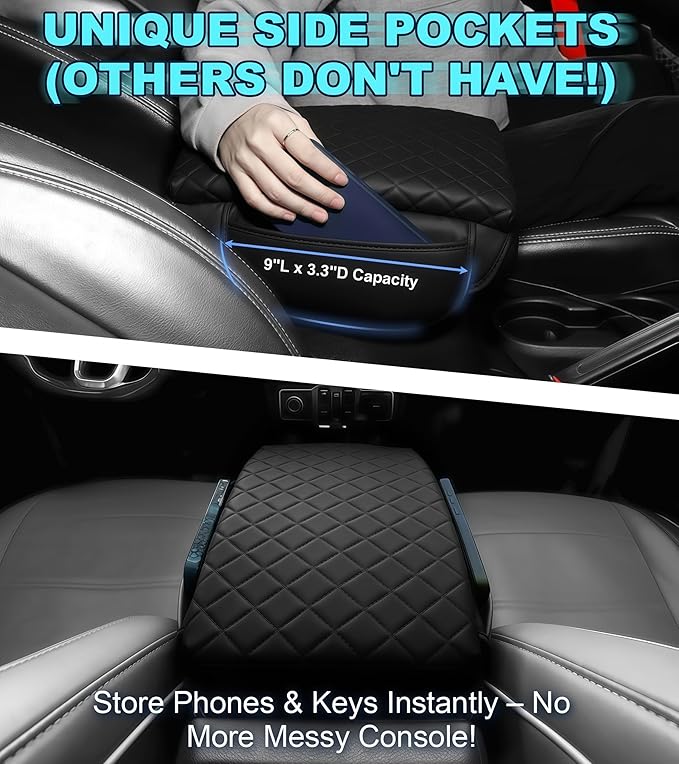 - [Dual-side Storage Bags] - This Wrangler arm rest pad has storage function. The Wrangler console cover convenient for driver and passenger to put some small items such like cards in. Pocket width: 9.4in, depth: 3.34in.