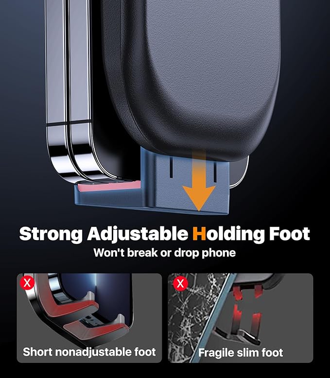 - Big Phones & Heavy Cases Friendly: The extended clamp arm and the adjustable strong holding foot design, making this car mount for iPhone fits small phone as well big phones, easy to hold phones wearing heavy cases, even wallet or ring. The phone clamp won't touch falsely your volume buttton or block camerain like other nonadjustable holders. This just right design let you record great moment on the road at any time. The qucik release button on the back of phone clamp let you get phone easily.