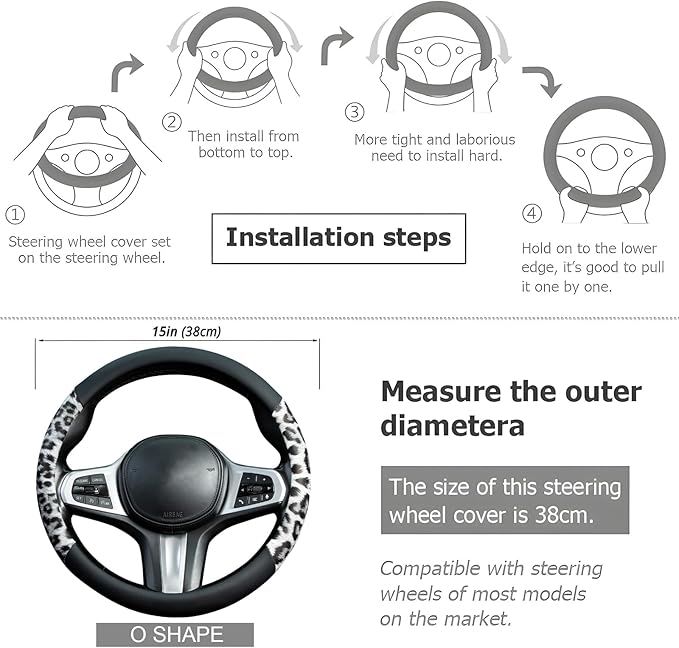 - NICE DESIGN : White Leopard steering wheel cover not only has a stylish appearance, but also provides you with safe and reliable protection. Non-slip inner ring can increase grip and reduce the shock of you hands when driving, it is protect your hands from the heat and cold and your steering wheel. It is a very good gift for friends, lover or family