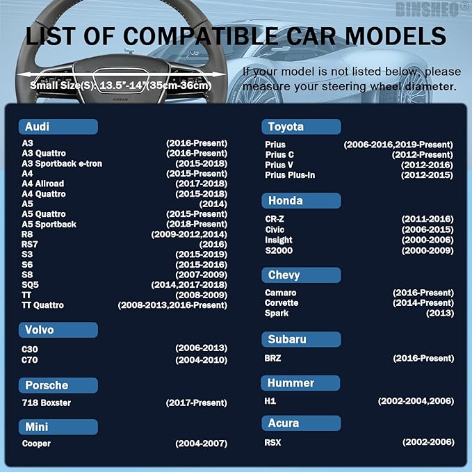 - [APPLICABLE] - Fits all small steering wheels from 13.5 inches to 14 inches (36 cm) in diameter, including car steering wheel covers (Prius, Civic, Audi A3, A4, etc.), boat steering wheel covers, golf cart steering wheel covers (Club Car and Yamaha, etc.). Measure your steering wheel size carefully before purchasing please.