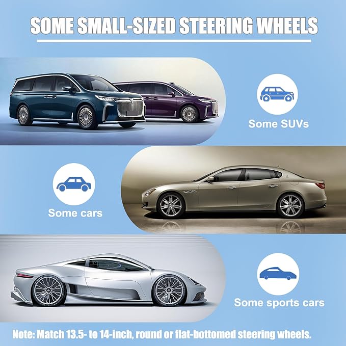 - [APPLICABLE] - Fits all small steering wheels from 13.5 inches to 14 inches (36 cm) in diameter, including car steering wheel covers (Prius, Civic, Audi A3, A4, etc.), boat steering wheel covers, golf cart steering wheel covers (Club Car and Yamaha, etc.). Measure your steering wheel size carefully before purchasing please.