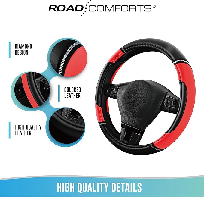 Road Comforts Leather Steering Wheel Cover - Made with PVC Leather - Anti-Slip, Universal Fit 14 1/2 inches to 15 inches - Red