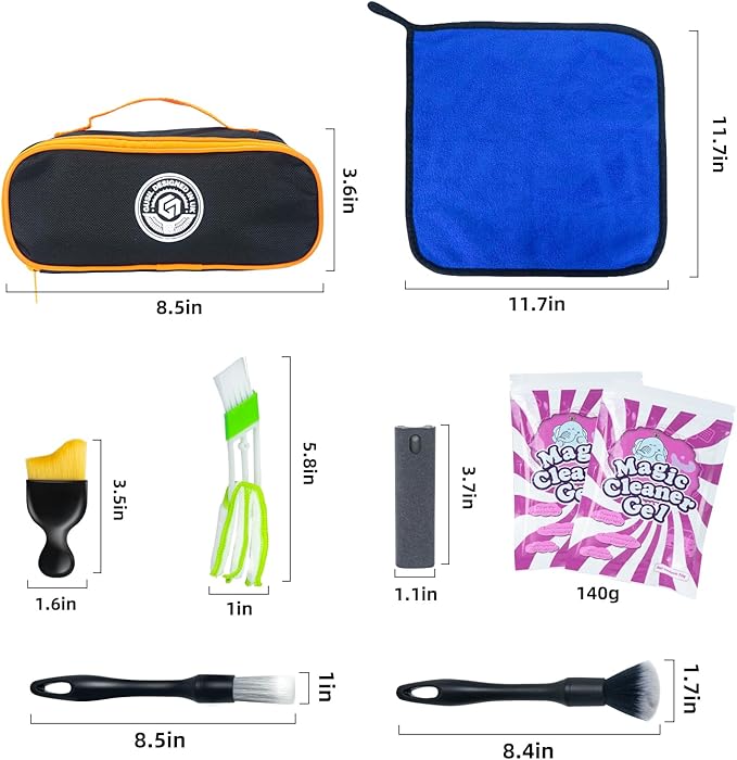 - [8PCS Car Interior Cleaning Kit]: Comprising 2 x 70g Cleaning Gel Bags, 1 Car Screen Cleaner (specifically formulated for LCD/LED displays), 1 Yellow Ultra-Soft Brush, 2 x Black Long-Handle Brushes, 1 Green 2-in-1 Vent Brush, 1 Yellow Microfiber Cloth, and 1 Premium Portable Storage Case. (Ideal for professional-grade interior detailing)