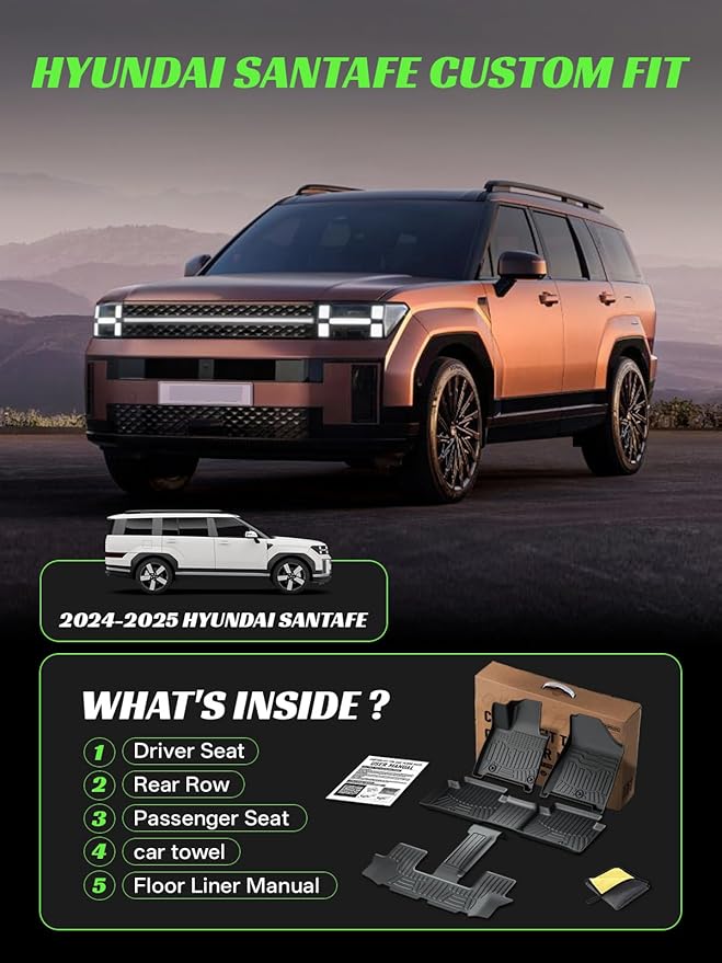 - 【TPE Material 】Our car floor mats are made of TPE (Thermoplastic Elastomer) material, which is recyclable, odorless, non-toxic, wear-resistant and durable. Our floor liners for Hyundai SantaFe features high heat resistance and flexibility, capable of adapting to all kinds of extreme weather conditions. There is no need to worry about the car mats cracking, curling or splitting, ensuring a safe and comfortable driving environment for you and your family.