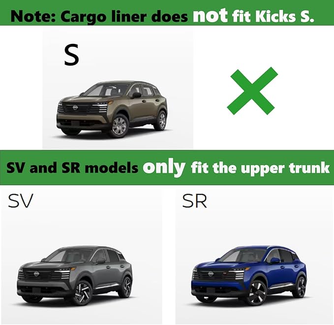 - Custom Fit: Floor mats fit for Nissan Kicks 2025 2026 SV/SR (Not for S).Includes 2 front floor mats & 1 rear floor mat & 1 cargo liner & 1 backrest cargo mat. If creases are caused by transportation, please put the mats in the sun for a while or blow them with a hair dryeries