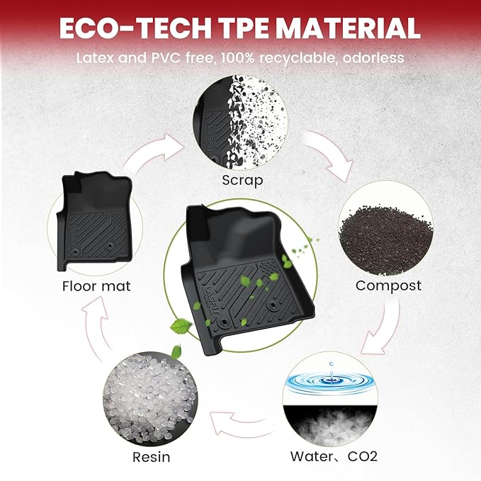 - ENVIRONMENT FRIENDLY- Tacoma mats use elastic TPE (Thermoplastic Elastomer), No foul odor is produced even at high temperatures. soft touch and exquisite finish. The Lasfit Tacoma floor mats are skid-proof and recyclable.