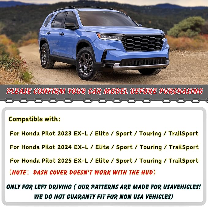 - 【PERFECT MATCH】:The Dash Cover is meticulously crafted to provide a perfect fit for Honda Pilot 2023 2024 2025 EX-L / Elite / Sport / Touring / TrailSport Model, (dash cover doesn't work with the HUD)enhancing the overall look of your vehicle's interior. (Note:Only for left driving)