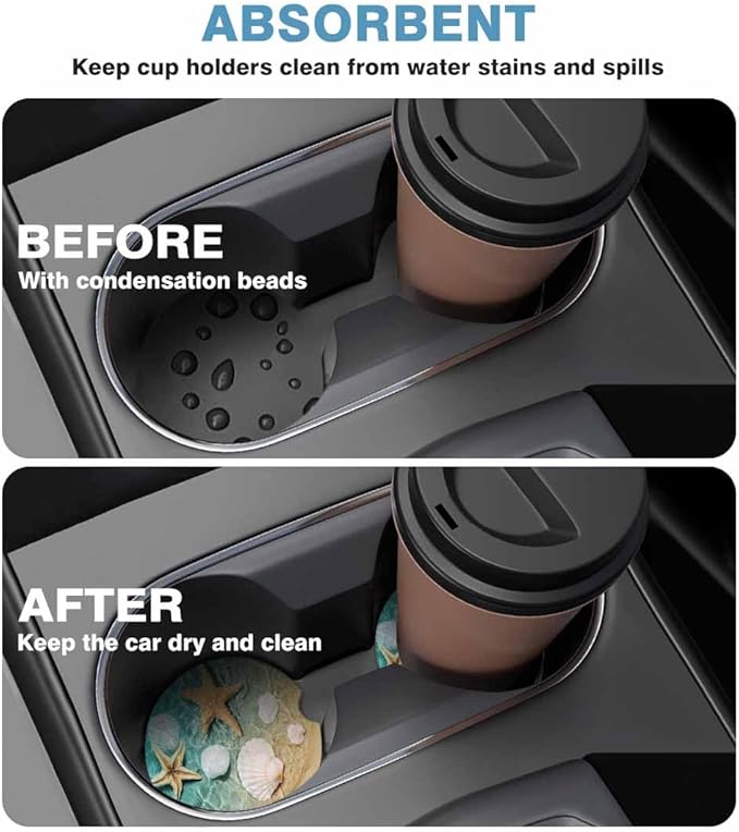 - Absorbent Coasters - Our car cup holder coaster are made of high-quality marble ceramics, and adopts a unique process and has excellent water absorption. It can quickly absorb all condensation, spilled coffee and cola stains in 10-15 seconds, keep the car dry and clean