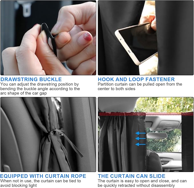 - 【Premium Material】This Car Divider Privacy Curtain is made of high-quality polyester pongee, with high density and thickening treatment, delicate touch, good air permeability, comfortable, durable. It has excellent light-blocking performance, creating a private space exclusively for you in the back seat.