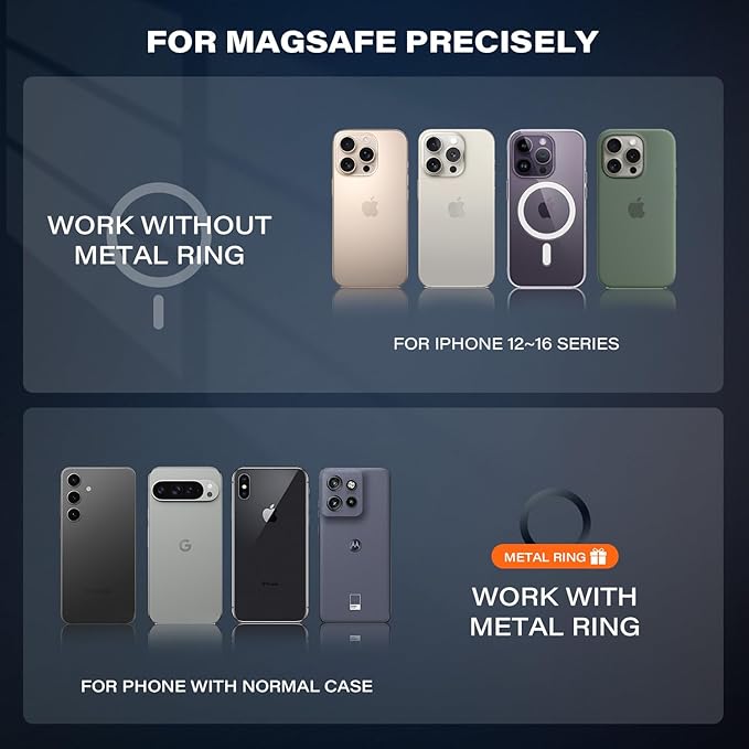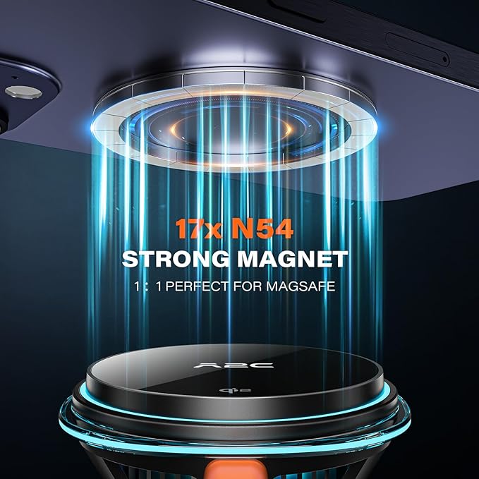 - Designed Exclusively for MagSafe: Equipped with 17 N54 magnets, this phone mount for car wireless charger delivers 20N of magnetic force for a secure, shake-free grip—even on bumpy roads. Compatible with iPhone 12/13/14/15/16/17 series (excluding iPhone 16e)