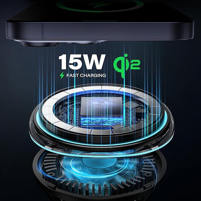 - Built-in Cooling for Smarter Charging: Stay powered without overheating. Featuring a semiconductor cooling chip and an active fan, this for magsafe wireless car charger mount keeps your device up to 41°F cooler than standard wireless chargers—ideal for long drives and GPS navigation