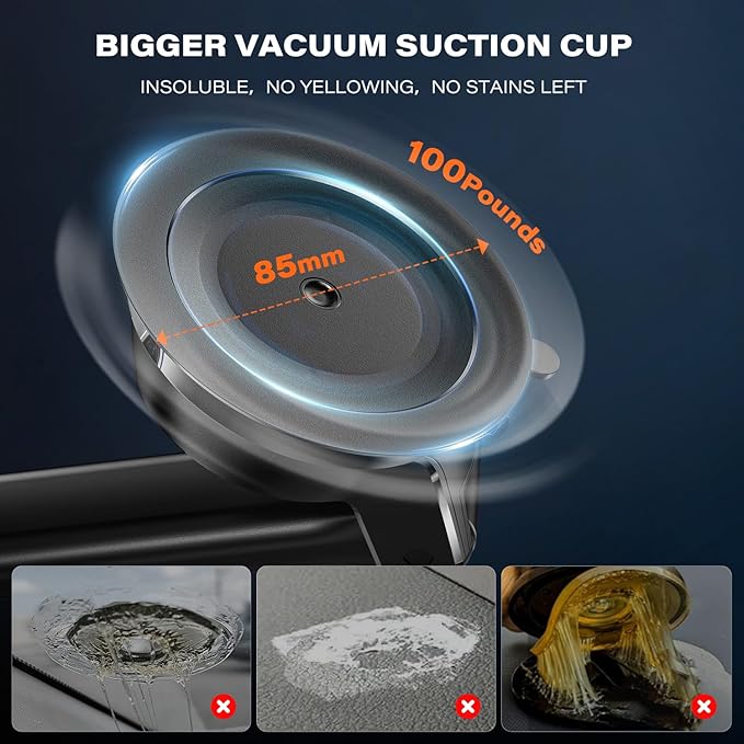 - Ultra-Large 85mm Vacuum Suction Cup: Our advanced vacuum design features a significantly wider suction cup (increased from 2.5in to 3.3in), delivering 45% stronger suction than traditional press-on mounts. It remains securely stable even on bumpy roads or during sudden stops. If suction weakens from dust, simply rinse the gel pad with water and air-dry to restore up to 99% of its original stickiness. Engineered to perform in extreme conditions, it withstands temperatures from -40°F to 194°F